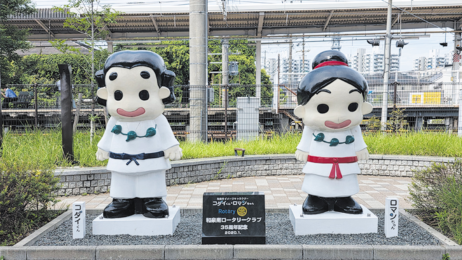 和泉市には弥生時代の巨大遺跡である池上曽根遺跡があるため、コダイくんとロマンちゃんは弥生人がモチーフとなっています。JR 阪和線の和泉府中駅には、コダイくんとロマンちゃんの像が設置されており、和泉市の玄関口で人々を迎えています。