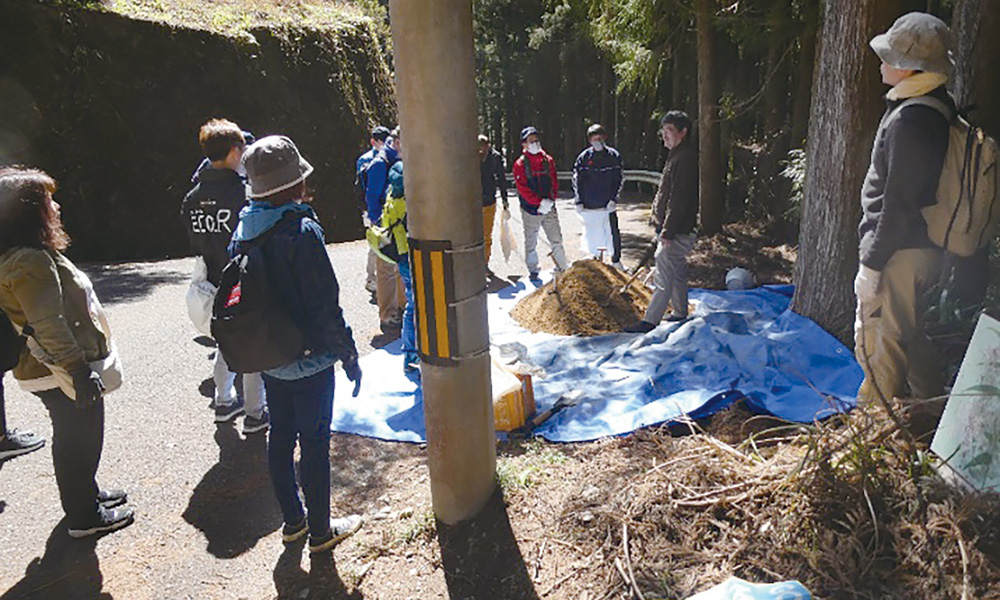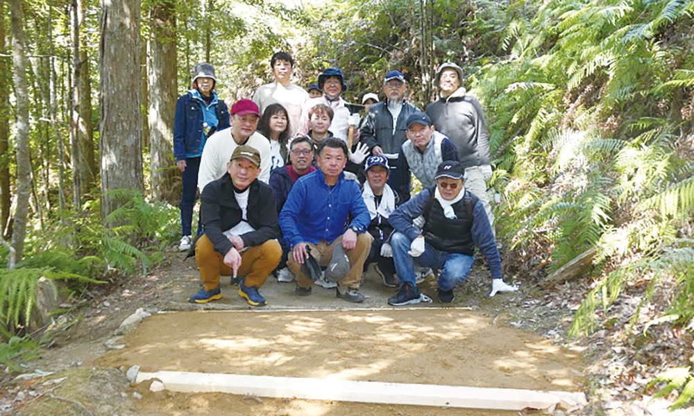 3月9日(日)熊野古道の「道普請」を実施しました。8時半にマイクロバスで文里港を出発、現地集合のメンバーと合流したのちは、伏拝口バス停で下車。そこから三軒茶屋跡までは、世界遺産センターの担当者の解説を聞きながらトレッキングで現場へ。会員、ご家族、従業員の方々を含め、総勢16名が、早春の爽やかな陽気とともに、悠久の歴史を体感しました。