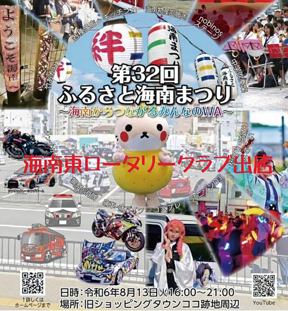 月13日(日)、第32回ふるさと海南まつりに海南東ロータリークラブ(会長 田岡郁敏)が出店しました。