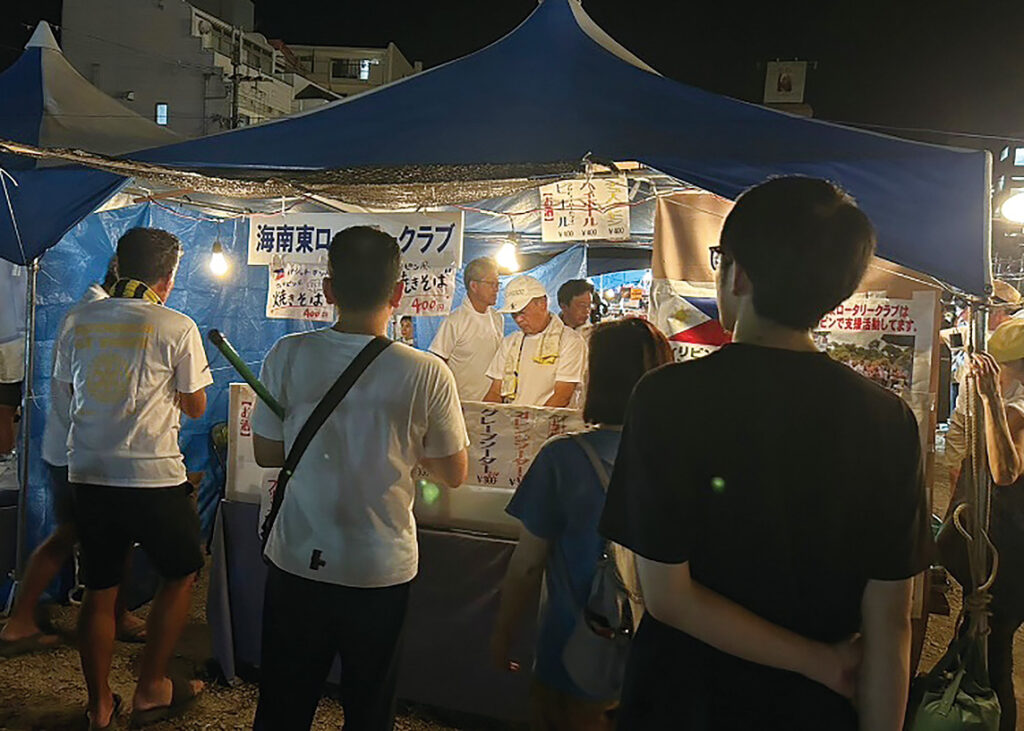 当クラブでは、社会奉仕、R財団、公共イメージ委員会を中心にロータリーの活動PR、認知度を高めるため、多くの市民が参加する同まつりに以前からロータリーデーとして毎年、出店しています。店先にはロータリーの活動紹介、ポリオ撲滅、ロータリー財団の支援を掲げ、収益金はロータリー財団に寄付します。