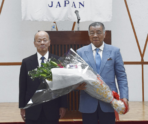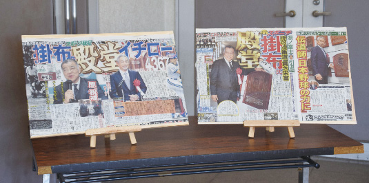 掛布氏の殿堂入りお祝いに花束を贈呈