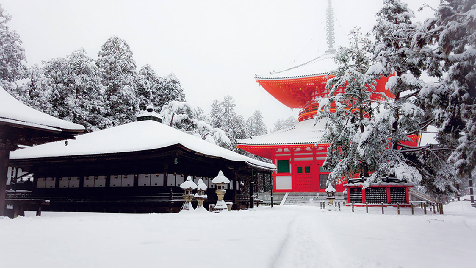 一際目を引く鮮やかな朱塗りの建物は、真言密教のシンボルである「根本大塔」。降り積もる純白の雪とのコントラストが、静寂の中に凛とした美しさを際立たせています。弘法大師・空海の祈りが息づく聖地の厳冬期。すべてを包み込むような静けさと澄んだ空気感が、見る者の心を穏やかに浄化してくれるような、趣深い景色です。